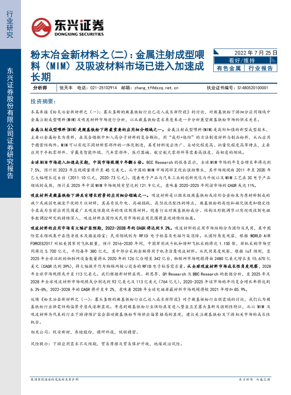 【东兴证券】【20220725】粉末冶金新材料之(二):金属注射成型喂料(MIM)及吸波材料市场已进入加速成长期-14页