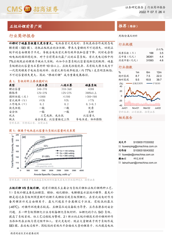 正极补锂 硅基负极 行业简评 金属及材料 锂离子电池