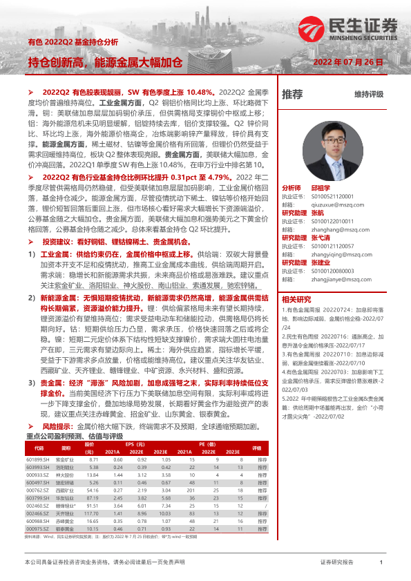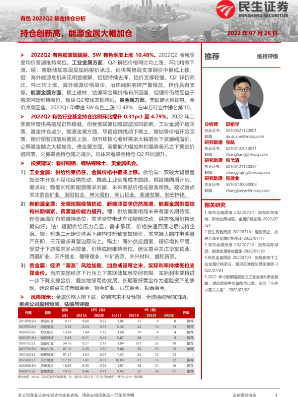 【民生证券】【20220726】有色2022Q2基金持仓分析:持仓创新高,能源金属大幅加仓-13页