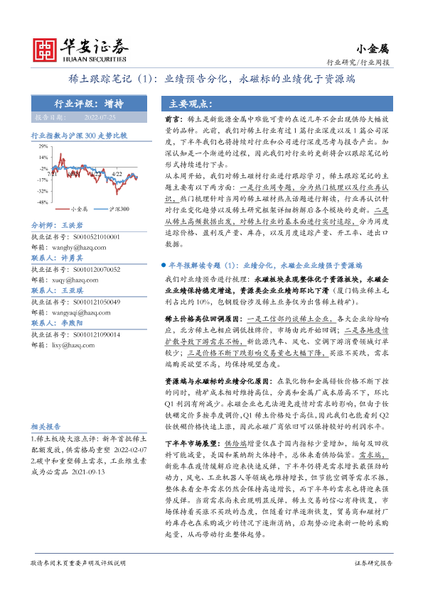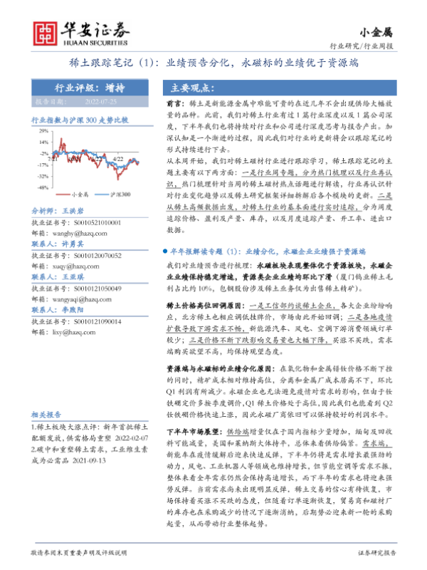 【华安证券】【20220725】20220725-华安证券-稀土跟踪笔记(1):业绩预告分化,永磁标的业绩优于资源端-15页