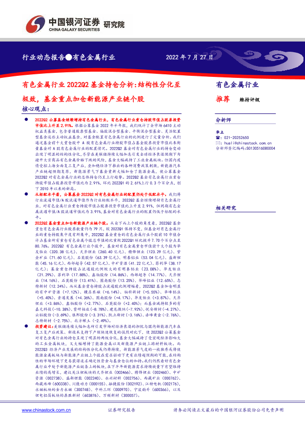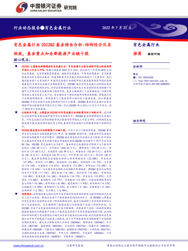【银河证券】【20220727】有色金属行业2022Q2基金持仓分析:结构性分化至极致,基金重点加仓新能源产业链个股-11页