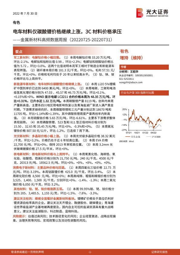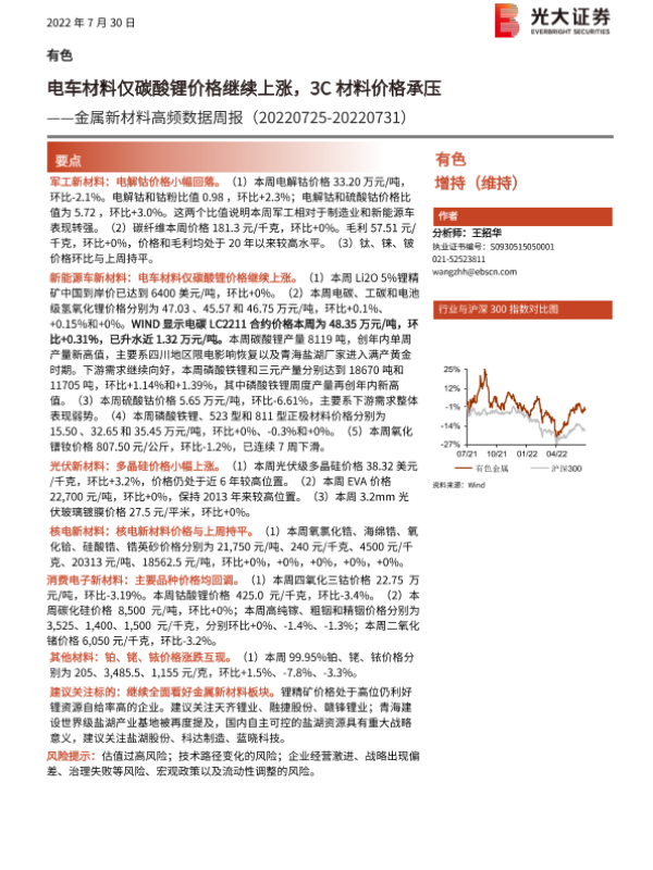 【光大证券】【20220730】金属新材料高频数据周报:电车材料仅碳酸锂价格继续上涨,3C材料价格承压-26页