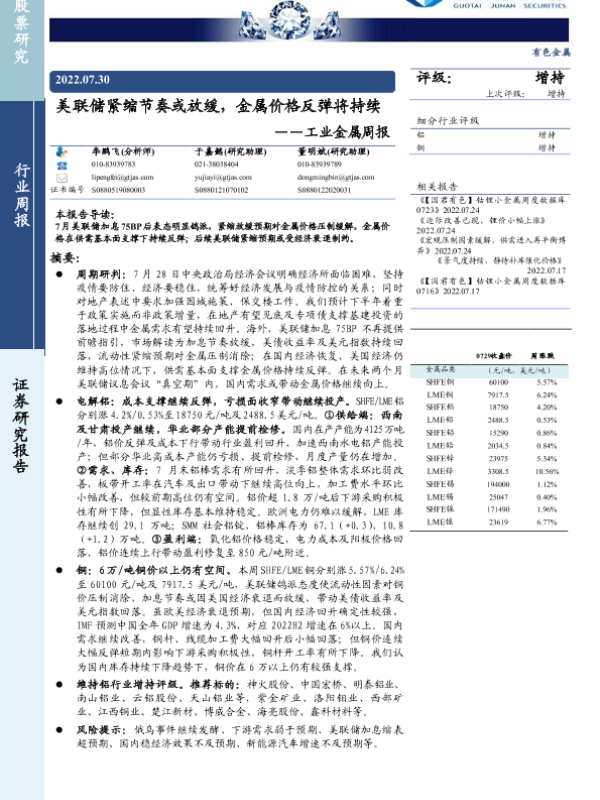 【国泰君安证券】【20220730】美联储紧缩节奏或放缓,金属价格反弹将持续——工业金属周报-9页