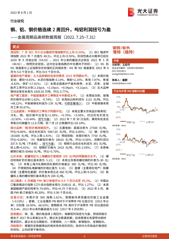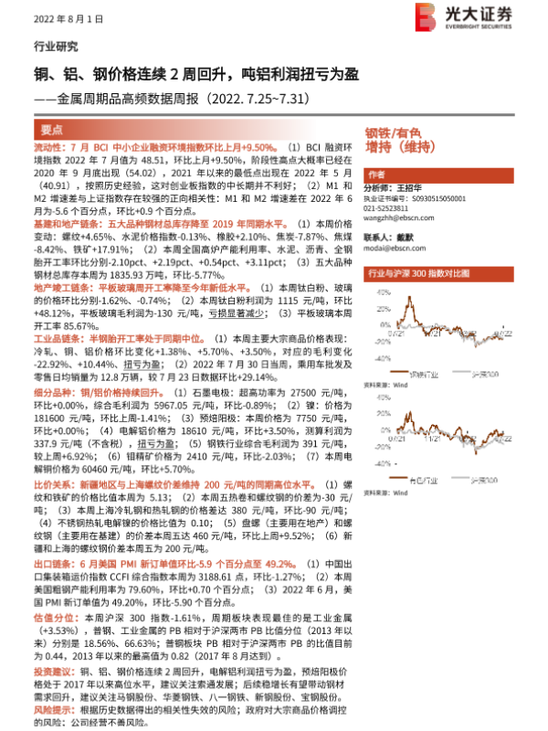 【光大证券】【20220801】金属周期品高频数据周报:铜、铝、钢价格连续2周回升,吨铝利润扭亏为盈-26页
