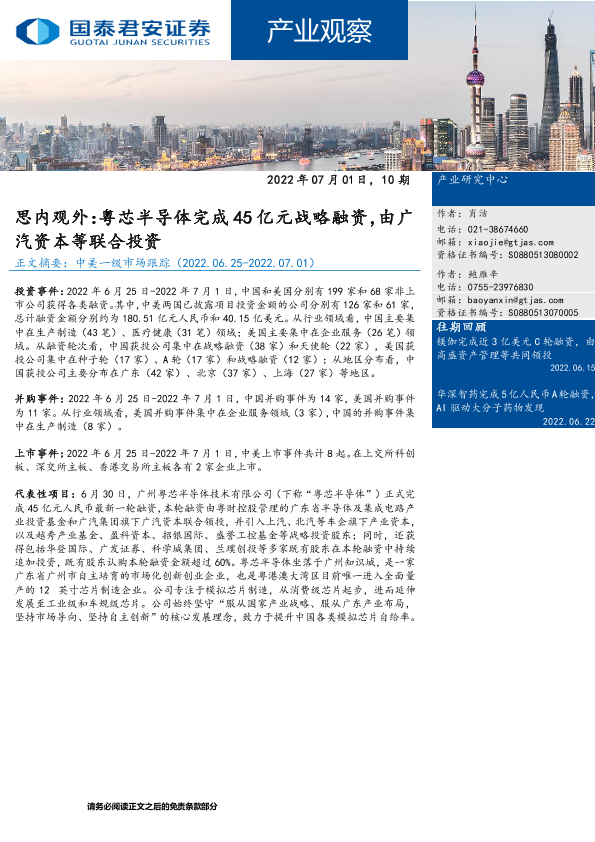 【国泰君安证券】【20220701】产业观察10期:思内观外,粤芯半导体完成45亿元战略融资,由广汽资本等联合投资-30页