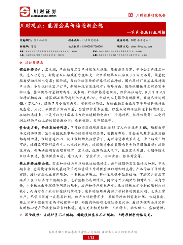 【川财证券】【20220806】20220806-川财证券-有色金属行业周报:川财观点:能源金属价格逐渐企稳-12页