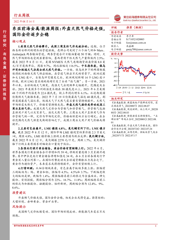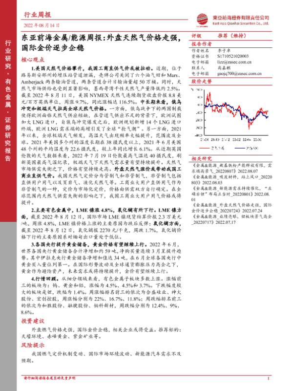 【东亚前海证券】【20220814】20220814-东亚前海证券-金属 能源周报:外盘天然气价格走强,国际金价逐步企稳-21页