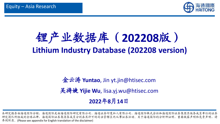 【海通国际】【20220814】锂产业数据库(202208版)-30页