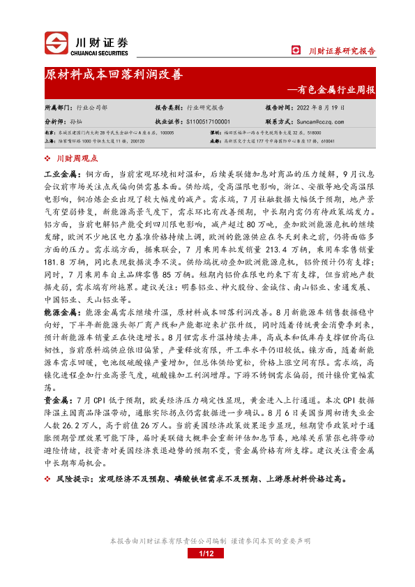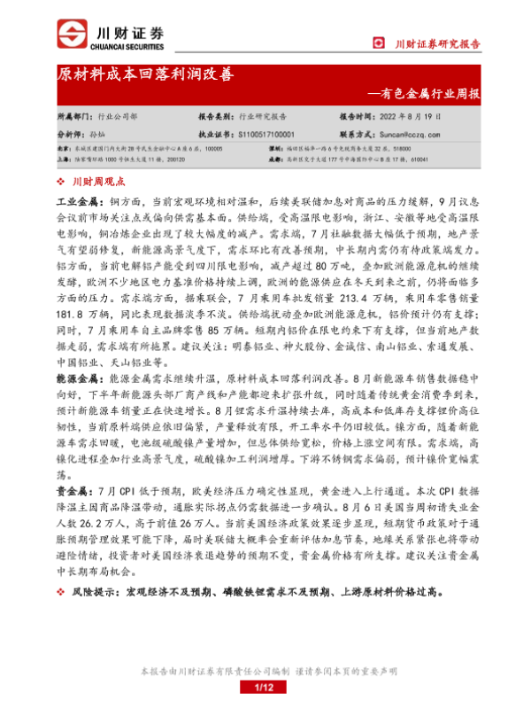 【川财证券】【20220819】20220819-川财证券-有色金属行业周报:原材料成本回落利润改善-12页