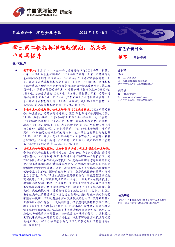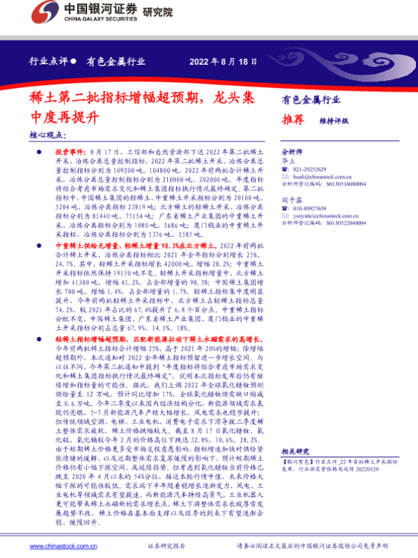 【银河证券】【20220818】有色金属行业:稀土第二批指标增幅超预期,龙头集中度再提升-3页