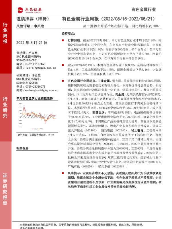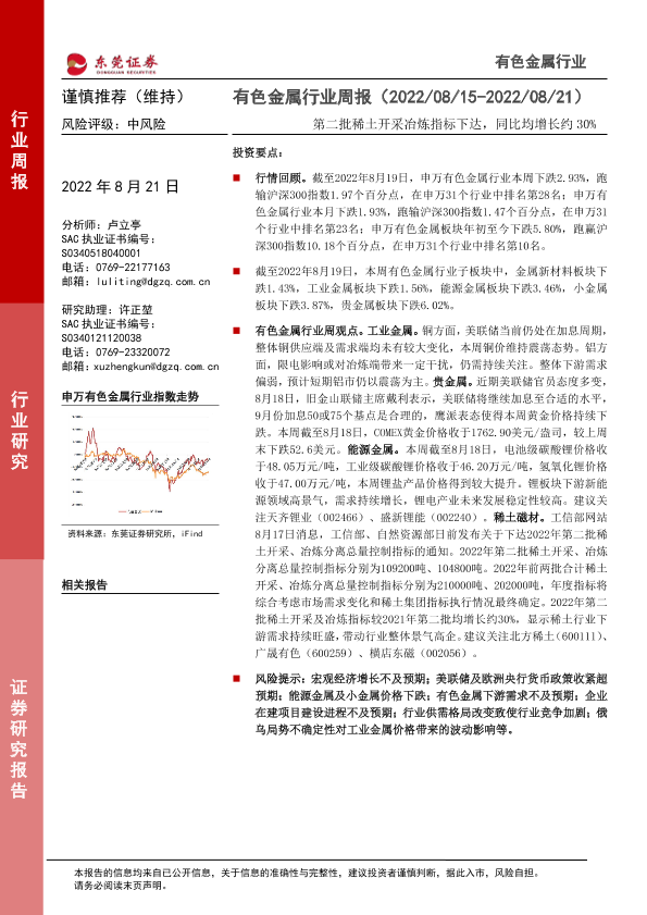 【东莞证券】【20220821】20220821-东莞证券-有色金属行业周报:第二批稀土开采冶炼指标下达,同比均增长约30%-11页