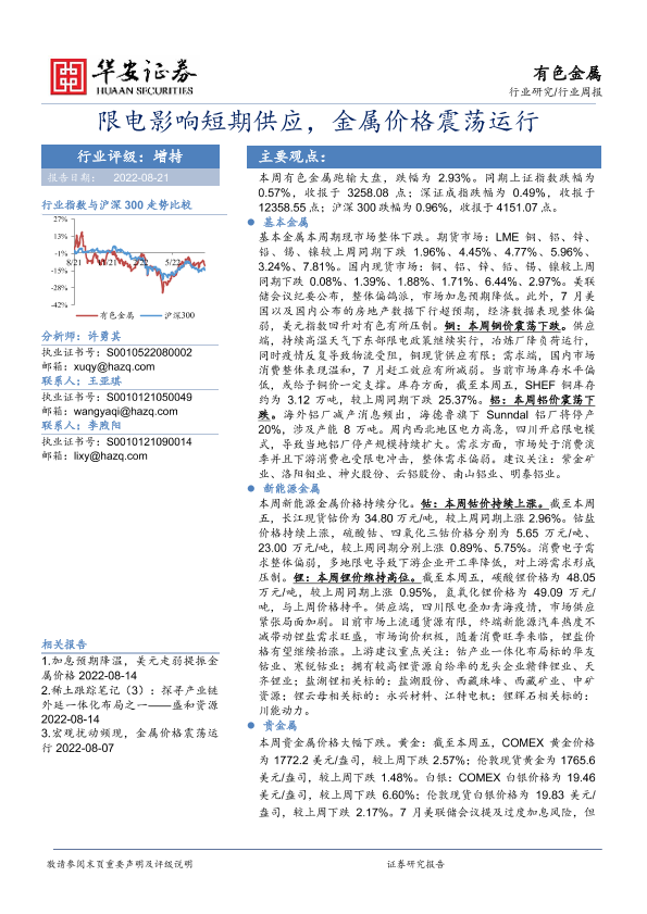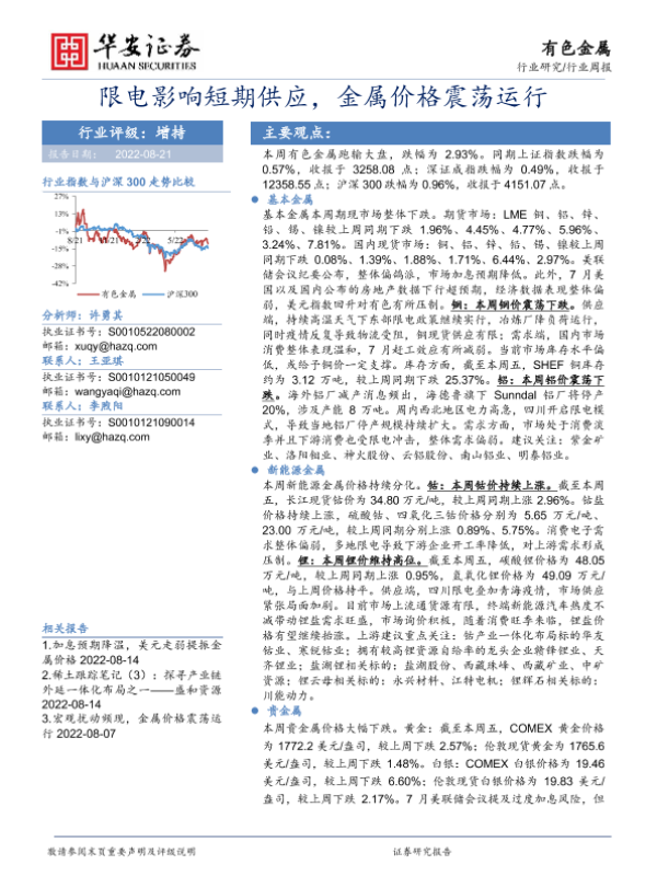 【华安证券】【20220821】20220821-华安证券-有色金属行业周报:限电影响短期供应,金属价格震荡运行-17页