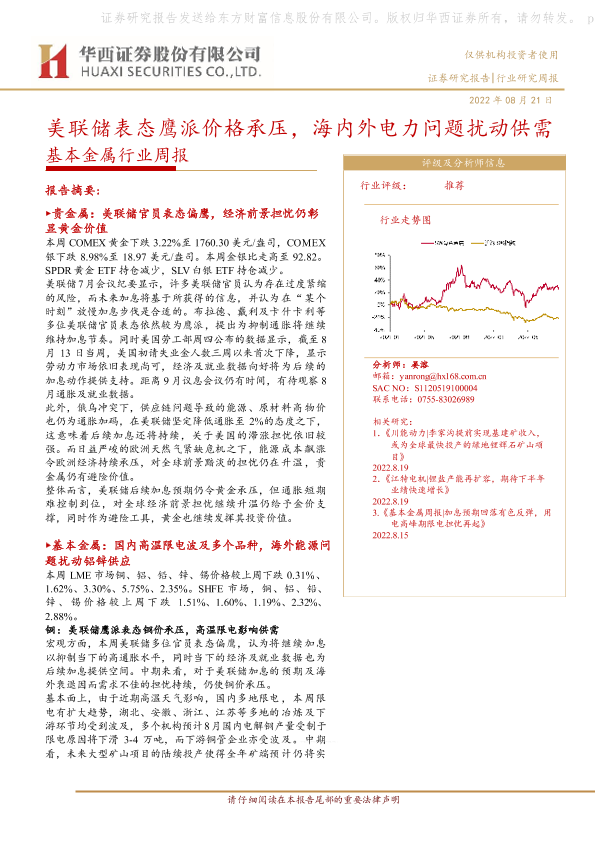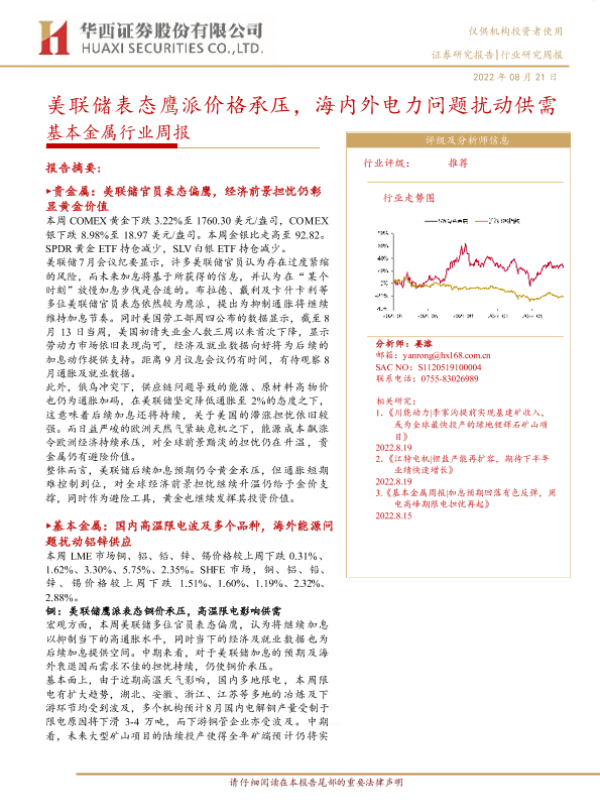 【华西证券】【20220821】20220821-华西证券-基本金属行业周报:美联储表态鹰派价格承压,海内外电力问题扰动供需-23页