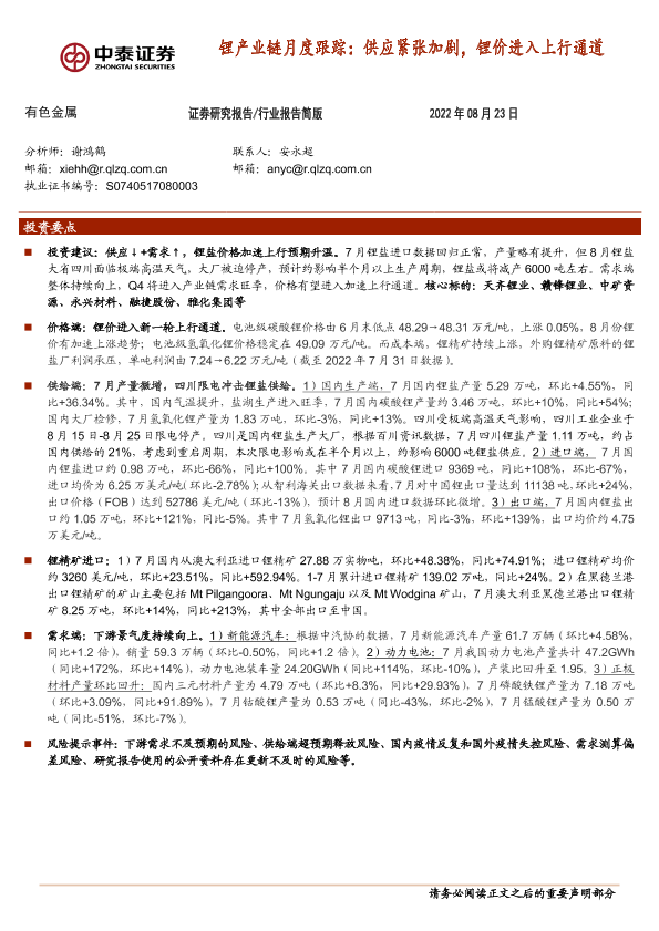 【中泰证券】【20220823】锂产业链月度跟踪:供应紧张加剧,锂价进入上行通道-12页