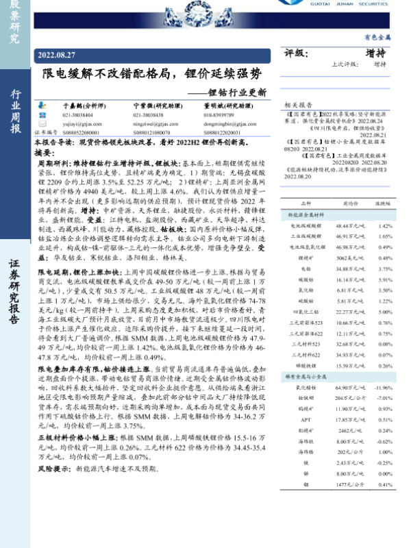 【国泰君安证券】【20220827】20220827-国泰君安-锂钴行业更新:限电缓解不改错配格局,锂价延续强势-13页