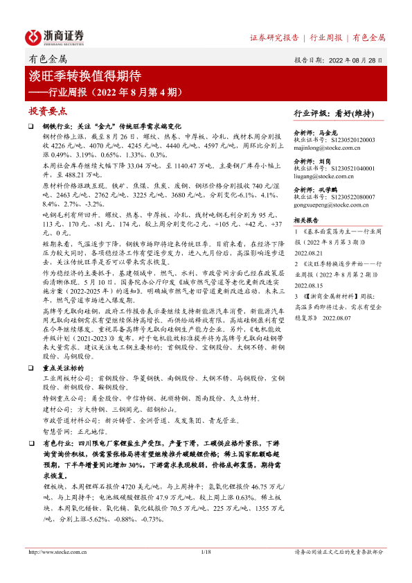 【浙商证券】【20220828】20220828-浙商证券-有色金属行业周报(2022年8月第4期):淡旺季转换值得期待-18页