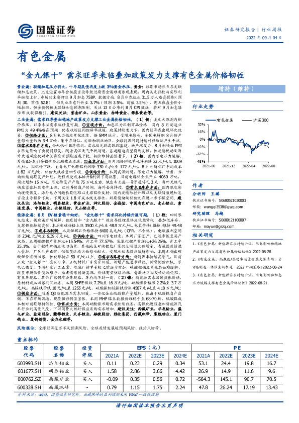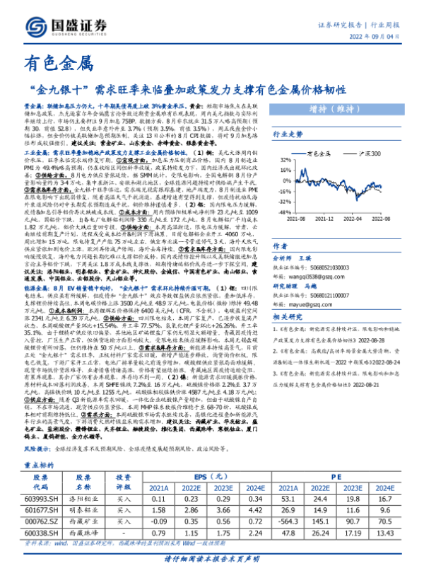 【国盛证券】【20220904】20220904-国盛证券-有色金属行业周报:“金九银十”需求旺季来临叠加政策发力支撑有色金属价格韧性-20页
