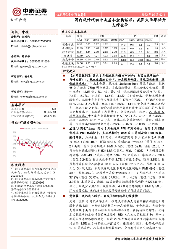 【中泰证券】【20220902】20220902-中泰证券-大宗金属行业周报:国内疫情扰动冲击基本金属需求,美国失业率抬升支撑金价-29页