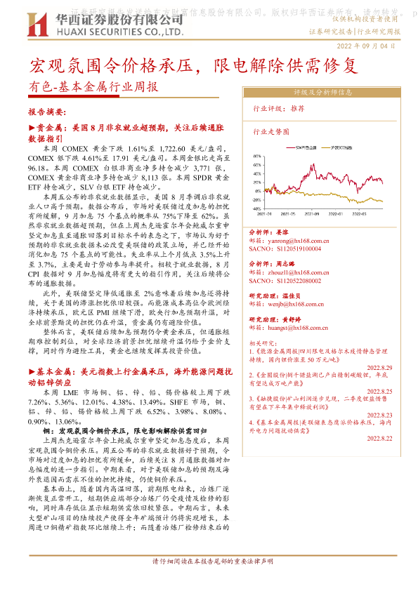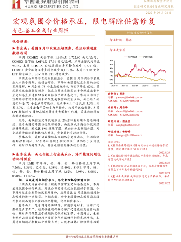 【华西证券】【20220904】20220904-华西证券-有色-基本金属行业周报:宏观氛围令价格承压,限电解除供需修复-22页