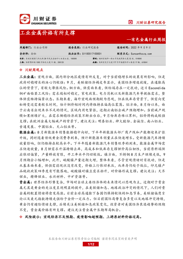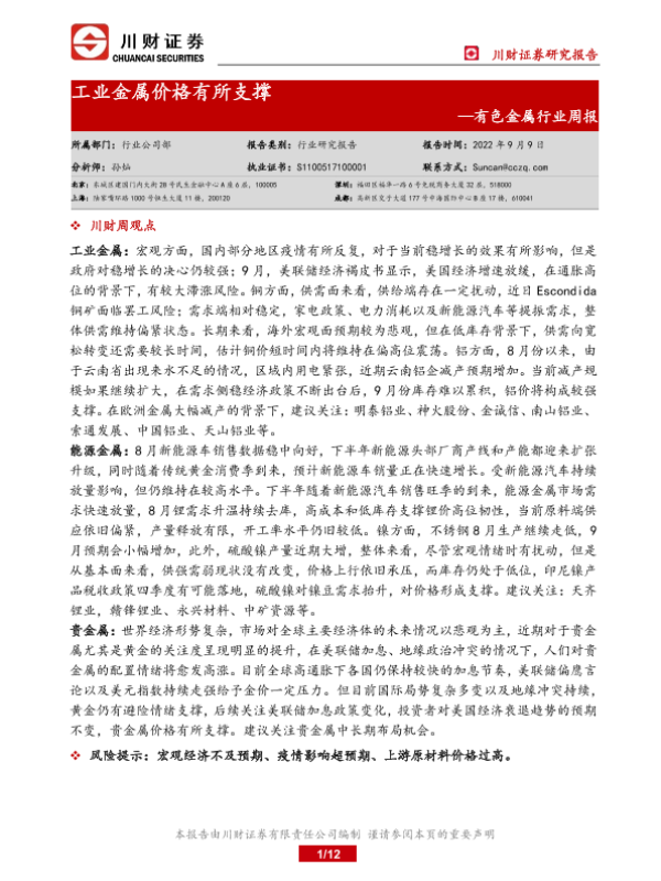 【川财证券】【20220909】20220909-川财证券-有色金属行业周报:工业金属价格有所支撑-12页