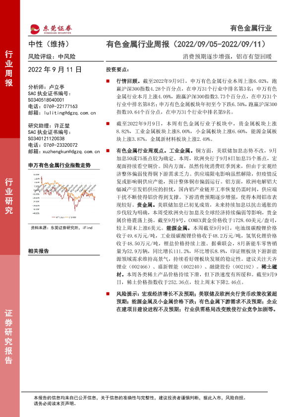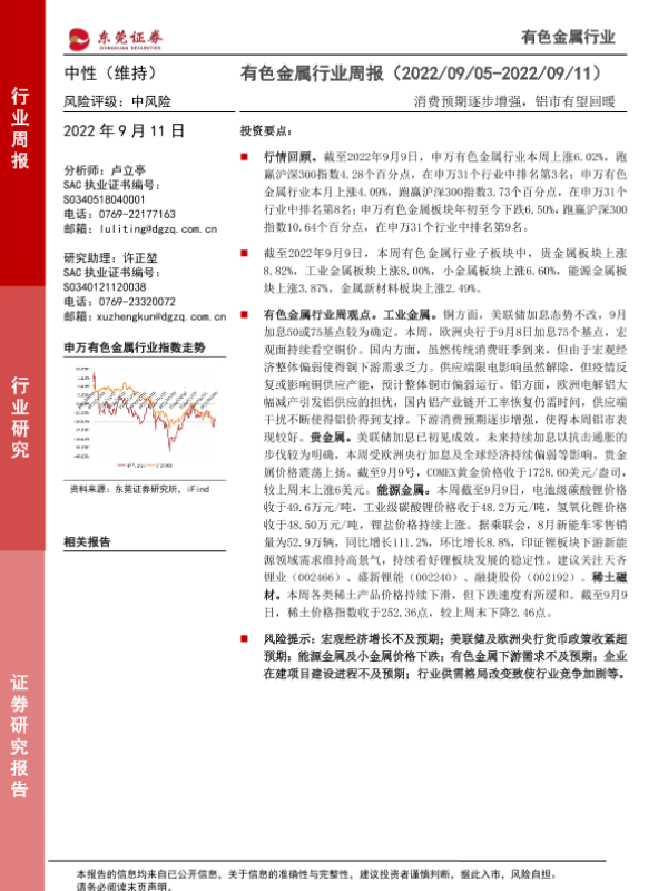 【东莞证券】【20220911】20220911-东莞证券-有色金属行业周报:消费预期逐步增强,铝市有望回暖-11页