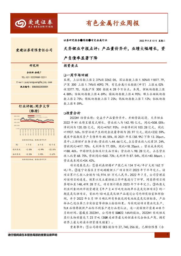 【爱建证券】【20220913】20220913-爱建证券-有色金属行业周报:天齐锂业中报点评:产品量价齐升,业绩大幅增长,资产负债率显著下降-25页
