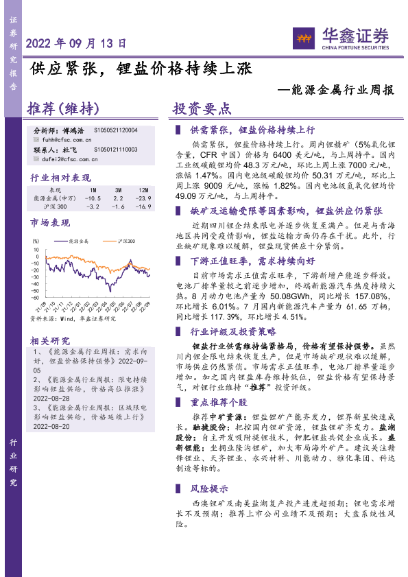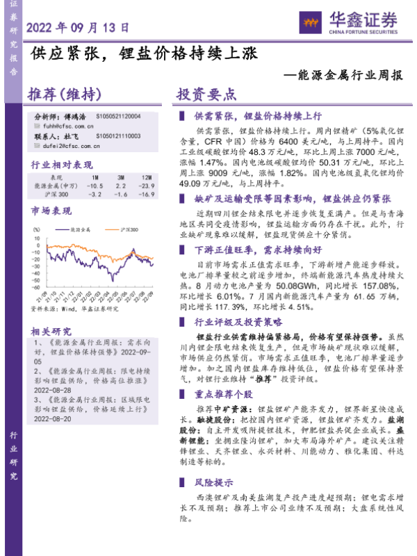 【华鑫证券】【20220913】20220913-华鑫证券-能源金属行业周报:供应紧张,锂盐价格持续上涨-12页