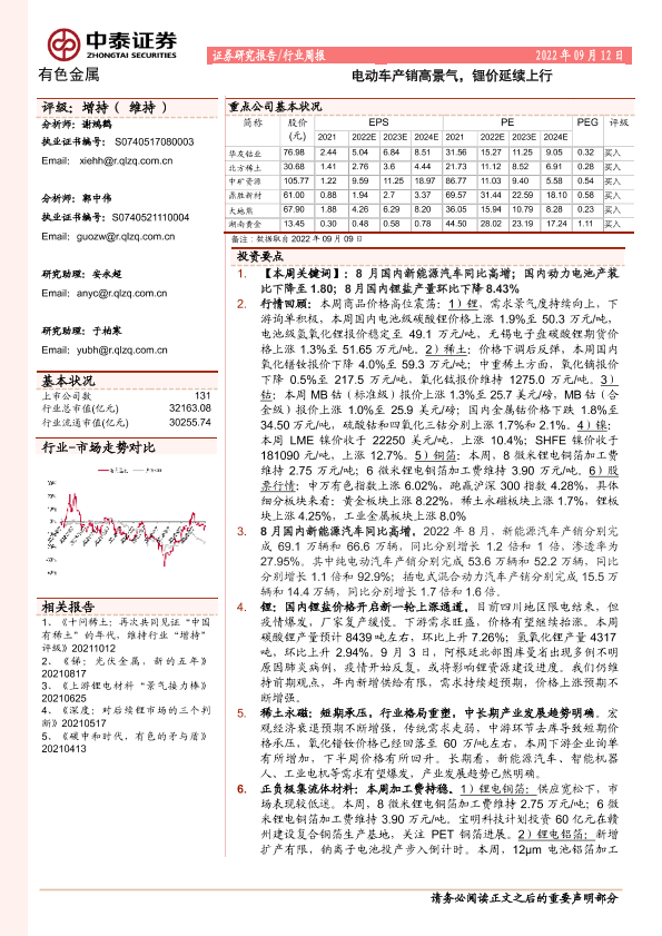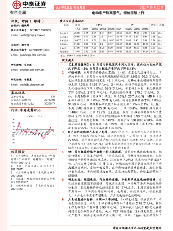 【中泰证券】【20220912】20220912-中泰证券-有色金属行业周报:电动车产销高景气,锂价延续上行-23页