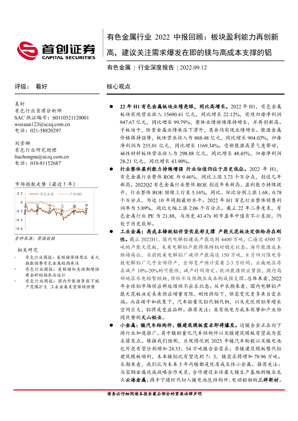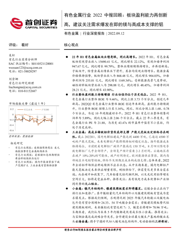 【首创证券】【20220912】有色金属行业2022中报回顾:板块盈利能力再创新高,建议关注需求爆发在即的镁与高成本支撑的铝-34页