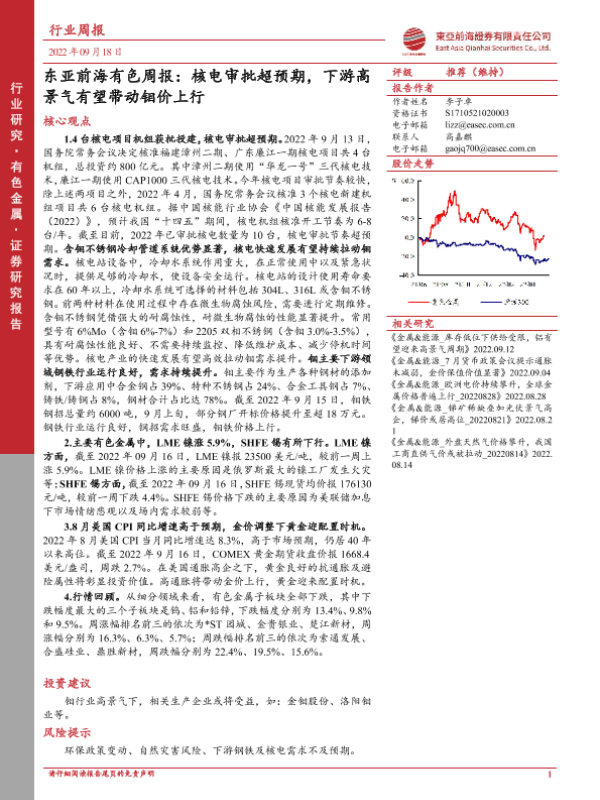 【东亚前海证券】【20220918】东亚前海有色周报:核电审批超预期,下游高景气有望带动钼价上行-21页