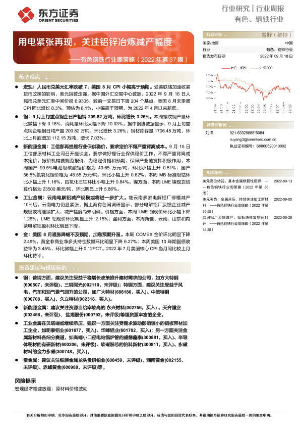 【东方证券】【20220918】有色钢铁行业周策略(2022年第37周):用电紧张再现,关注铝锌冶炼减产幅度-36页