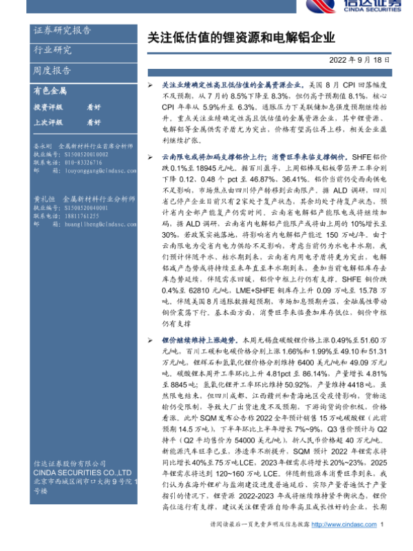 【信达证券】【20220918】20220918-信达证券-有色金属周度报告:关注低估值的锂资源和电解铝企业-11页