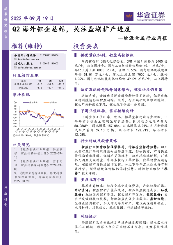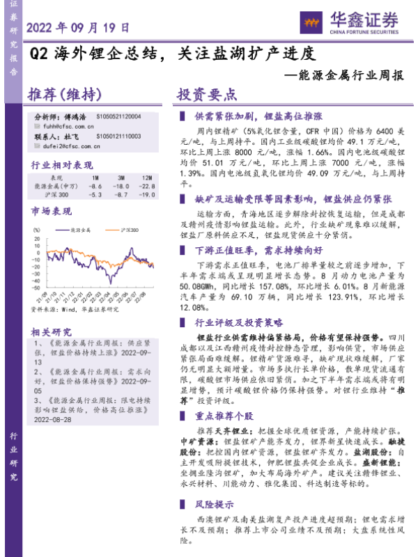 【华鑫证券】【20220919】20220919-华鑫证券-能源金属行业周报:Q2海外锂企总结,关注盐湖扩产进度-18页