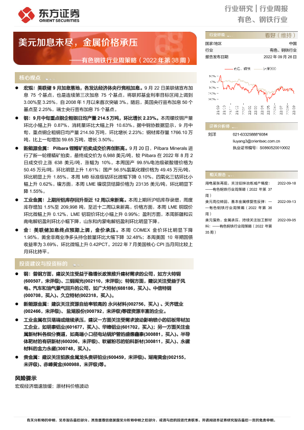 【东方证券】【20220926】20220926-东方证券-有色钢铁行业周策略(2022年第38周):美元加息未尽,金属价格承压-36页