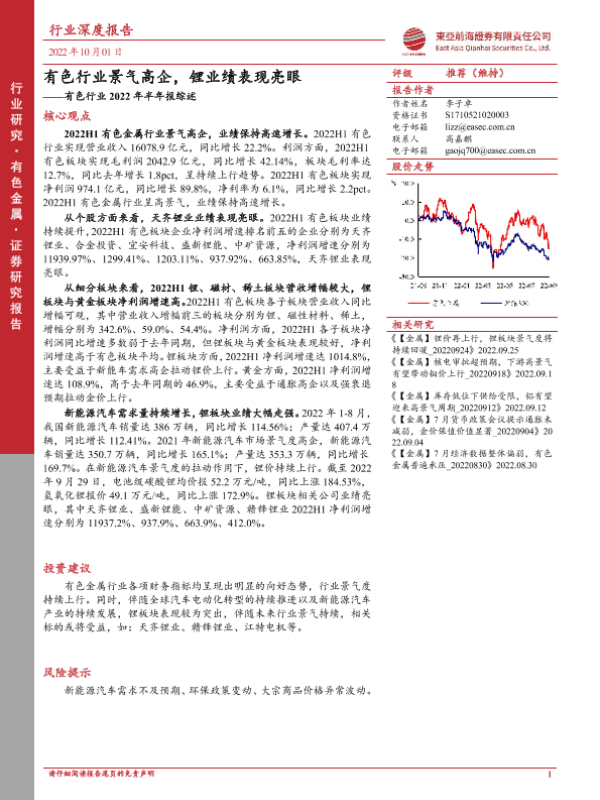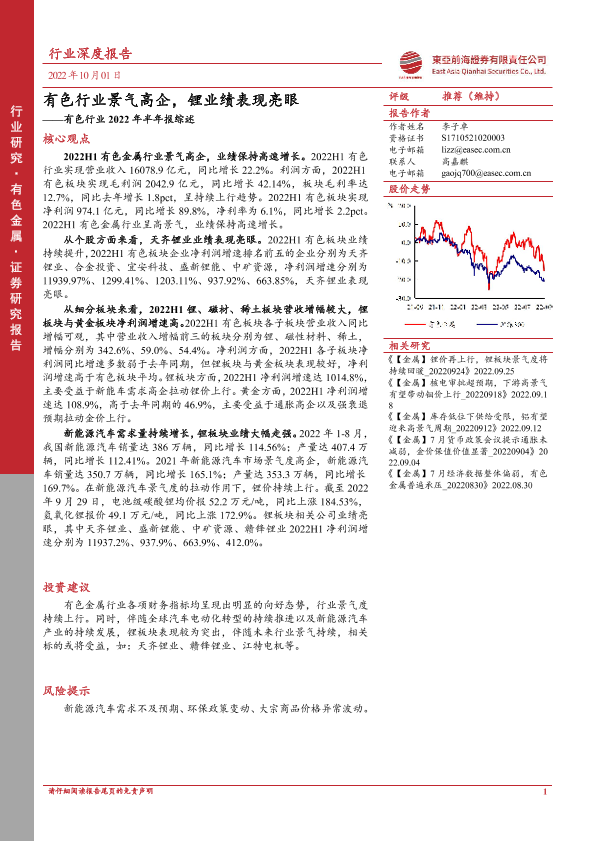 【东亚前海证券】【20221001】有色行业2022年半年报综述:有色行业景气高企,锂业绩表现亮眼-13页