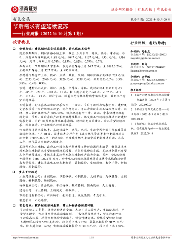 【浙商证券】【20221009】20221009-浙商证券-有色金属行业周报(2022年10月第1期):节后需求有望延续复苏-18页