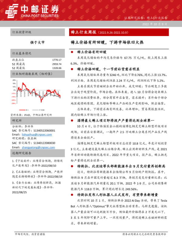 【中邮证券】【20221009】20221009-中邮证券-稀土行业周报:稀土价格有所回暖,下游市场依旧火热-13页
