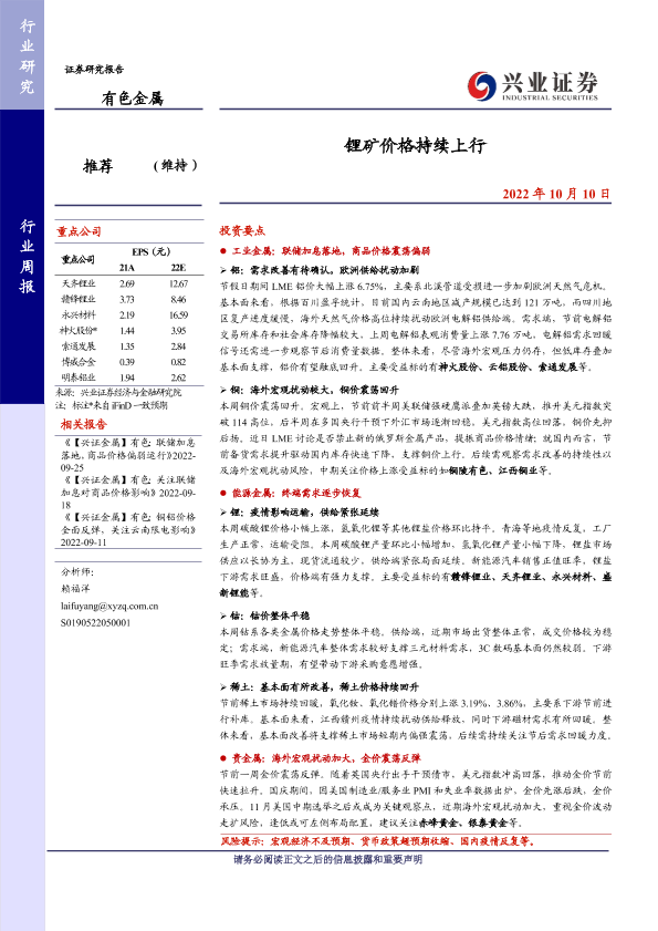 【兴业证券】【20221010】20221010-兴业证券-有色金属行业周报:锂矿价格持续上行-20页