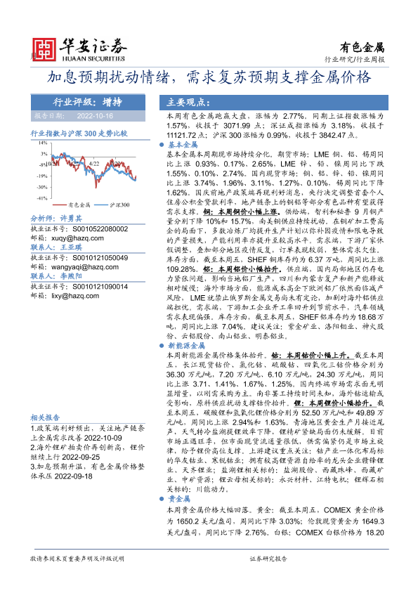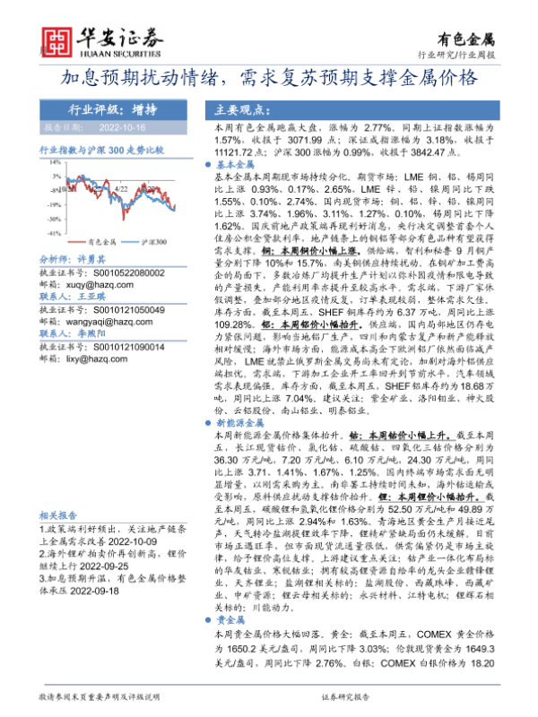 【华安证券】【20221016】20221016-华安证券-有色金属行业周报:加息预期扰动情绪,需求复苏预期支撑金属价格-17页