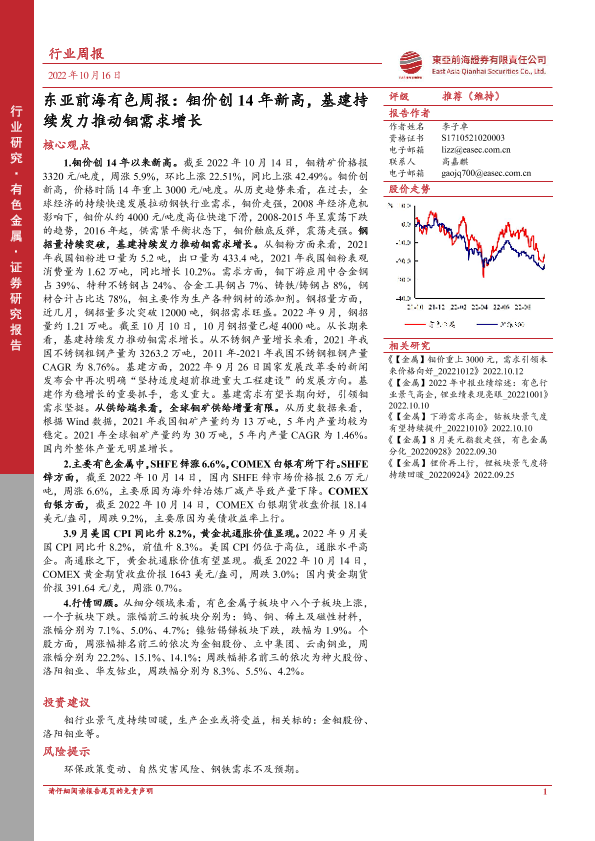 【东亚前海证券】【20221016】20221016-东亚前海证券-有色周报:钼价创14年新高,基建持续发力推动钼需求增长-20页