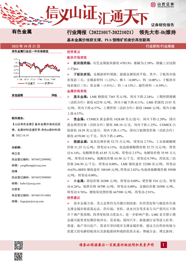 【山西证券】【20221021】20221021-山西证券-有色金属行业周报:基本金属价格获支撑,PLS锂精矿拍卖价再创新高-20页