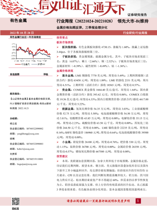 【山西证券】【20221028】20221028-山西证券-有色金属行业周报:金属价格如期反弹,三季报业绩分化-20页