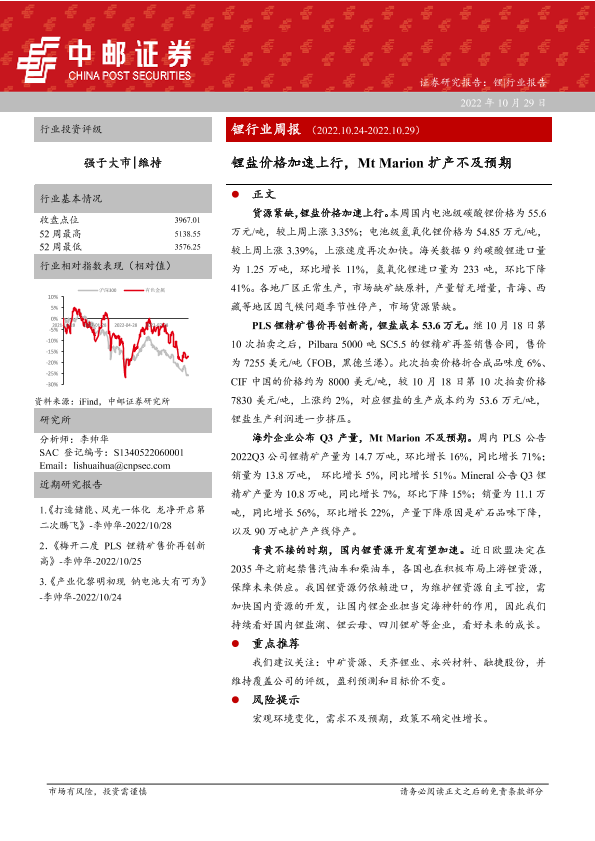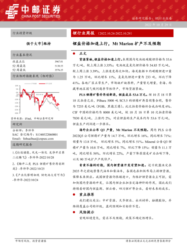 【中邮证券】【20221029】20221029-中邮证券-锂行业周报:锂盐价格加速上行,Mt Marion扩产不及预期-13页
