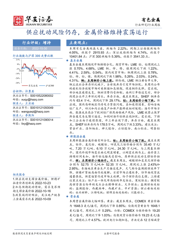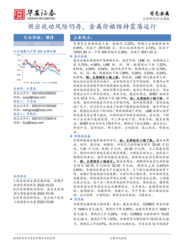 【华安证券】【20221030】20221030-华安证券-有色金属行业周报:供应扰动风险仍存,金属价格维持震荡运行-17页