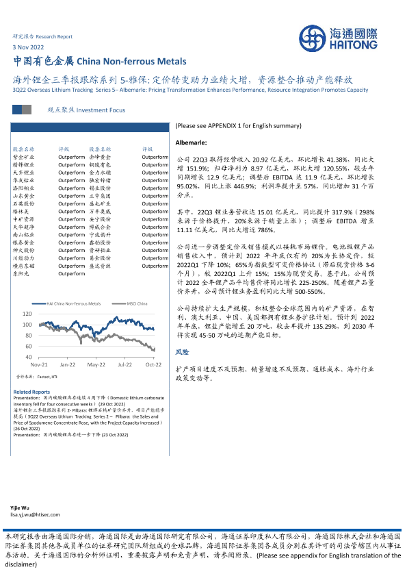 【海通国际】【20221103】中国有色金属:海外锂企三季报跟踪系列5-雅保 定价转变助力业绩大增,资源整合推动产能释放-12页