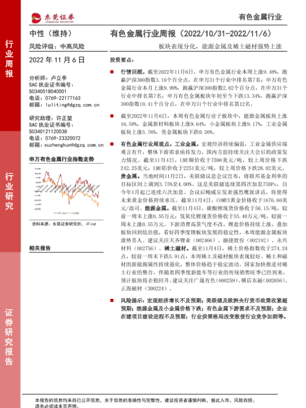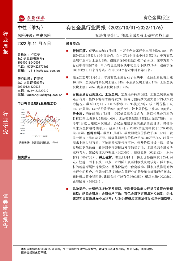 【东莞证券】【20221106】20221106-东莞证券-有色金属行业周报:板块表现分化,能源金属及稀土磁材强势上涨-11页