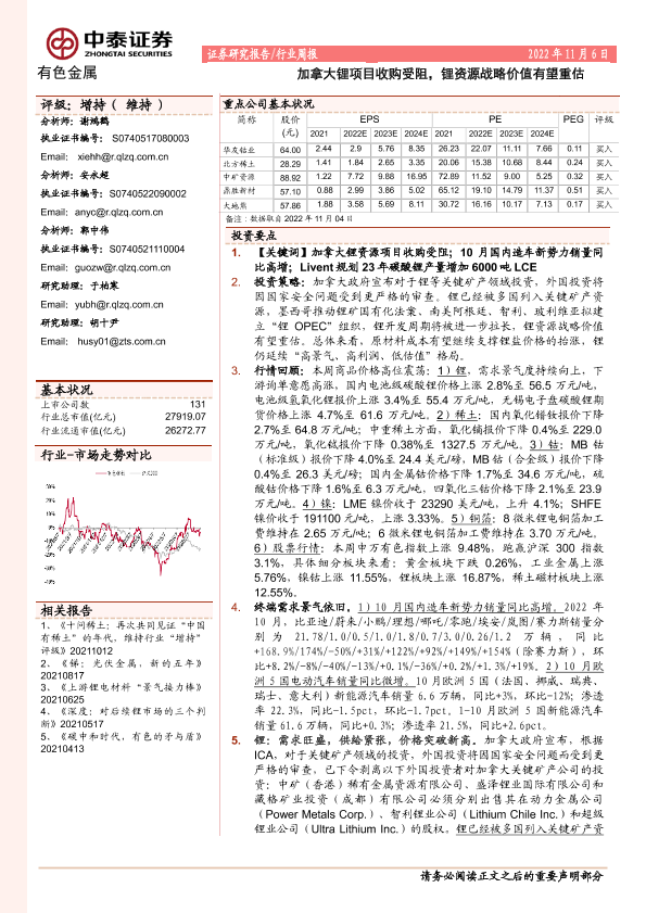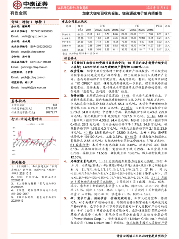 【中泰证券】【20221106】20221106-中泰证券-有色金属行业周报:加拿大锂项目收购受阻,锂资源战略价值有望重估-23页