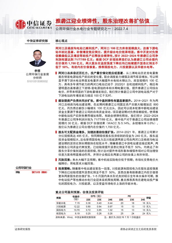 【中信证券】【20220704】公用环保行业水电行业专题研究之一:雅砻江迎业绩弹性,股东治理改善扩估值-23页