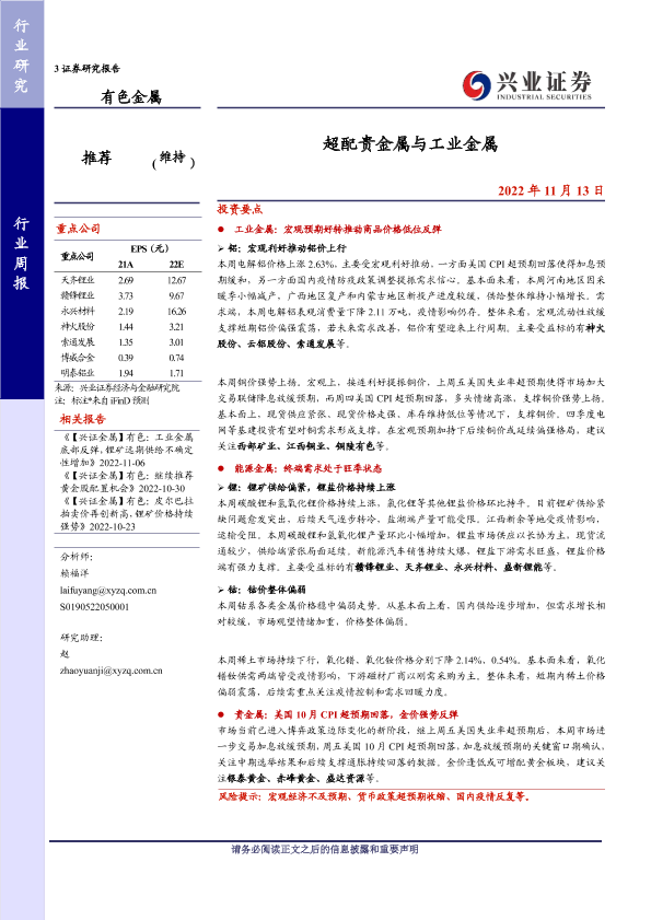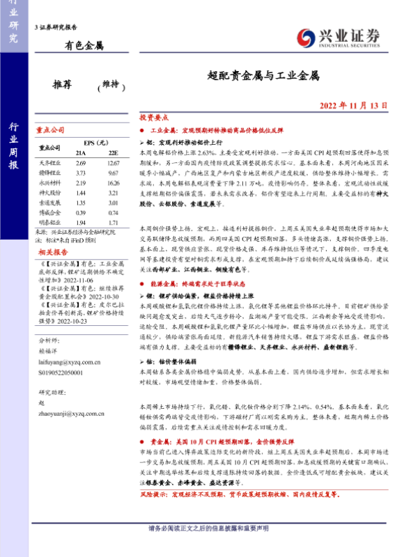 【兴业证券】【20221113】20221113-兴业证券-有色金属行业周报:超配贵金属与工业金属-22页