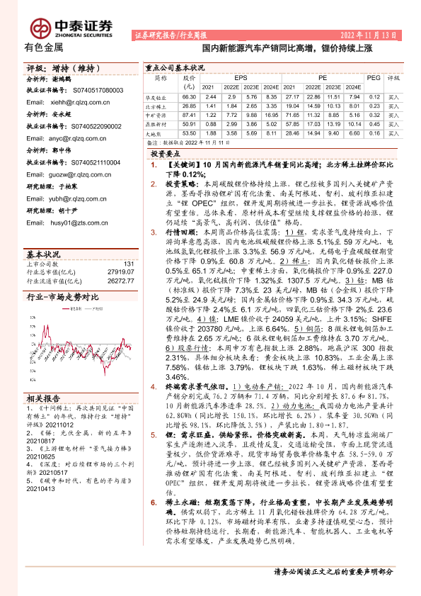 【中泰证券】【20221113】中泰证券-有色金属行业周报:国内新能源汽车产销同比高增,锂价持续上涨-23页